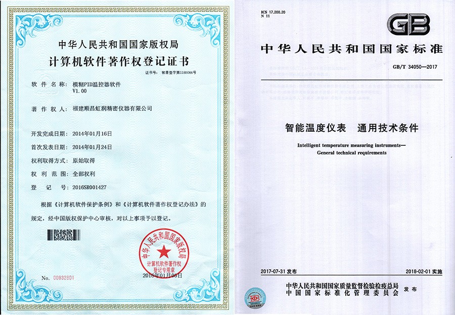 虹潤公司模糊PID溫控器是虹潤公司應(yīng)用自主知識產(chǎn)權(quán)開發(fā)的新一代智能控制儀表,產(chǎn)品榮獲模糊PID控制儀及控制方法(專利號2015109378814)、一種智能化控制器及自整定方法(2016103155465)2項國家發(fā)明專利,傻瓜式模糊PID調(diào)節(jié)儀軟件V1.00(版權(quán)登記號2015SR171602)、模糊PID溫控器軟件V1.00(版權(quán)登記號2016SR001427)2項軟件著作權(quán),主持起草《智能溫度儀表 通用技術(shù)條件 GB/T 34050-2017》《工業(yè)過程控制系統(tǒng)用模擬輸入兩位或多位輸出儀表第2部分:檢查和例行試驗導(dǎo)則》2項國家標準。其中《工業(yè)過程控制系統(tǒng)用模擬輸入兩位或多位輸出儀表第2部分:檢查和例行試驗導(dǎo)則》標準正在起草中。
