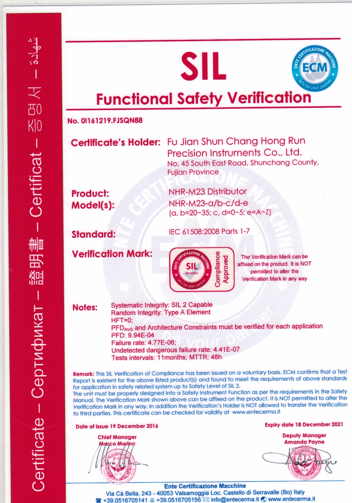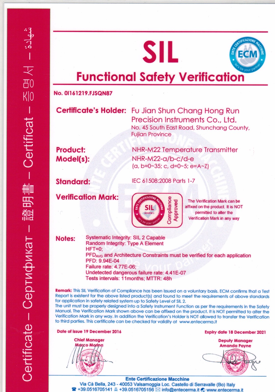 近日,虹潤智能儀表系列產(chǎn)品再傳喜訊,虹潤兩款智能儀表產(chǎn)品NHR-M22溫度變送器、NHR-M23配電器獲得了國際SIL2功能安全認(rèn)證證書。這標(biāo)志著虹潤儀表產(chǎn)品的安全性達(dá)到了國際標(biāo)準(zhǔn)。也為虹潤產(chǎn)品實現(xiàn)走向世界的美好愿景再一次打下了堅實的硬件基礎(chǔ)。