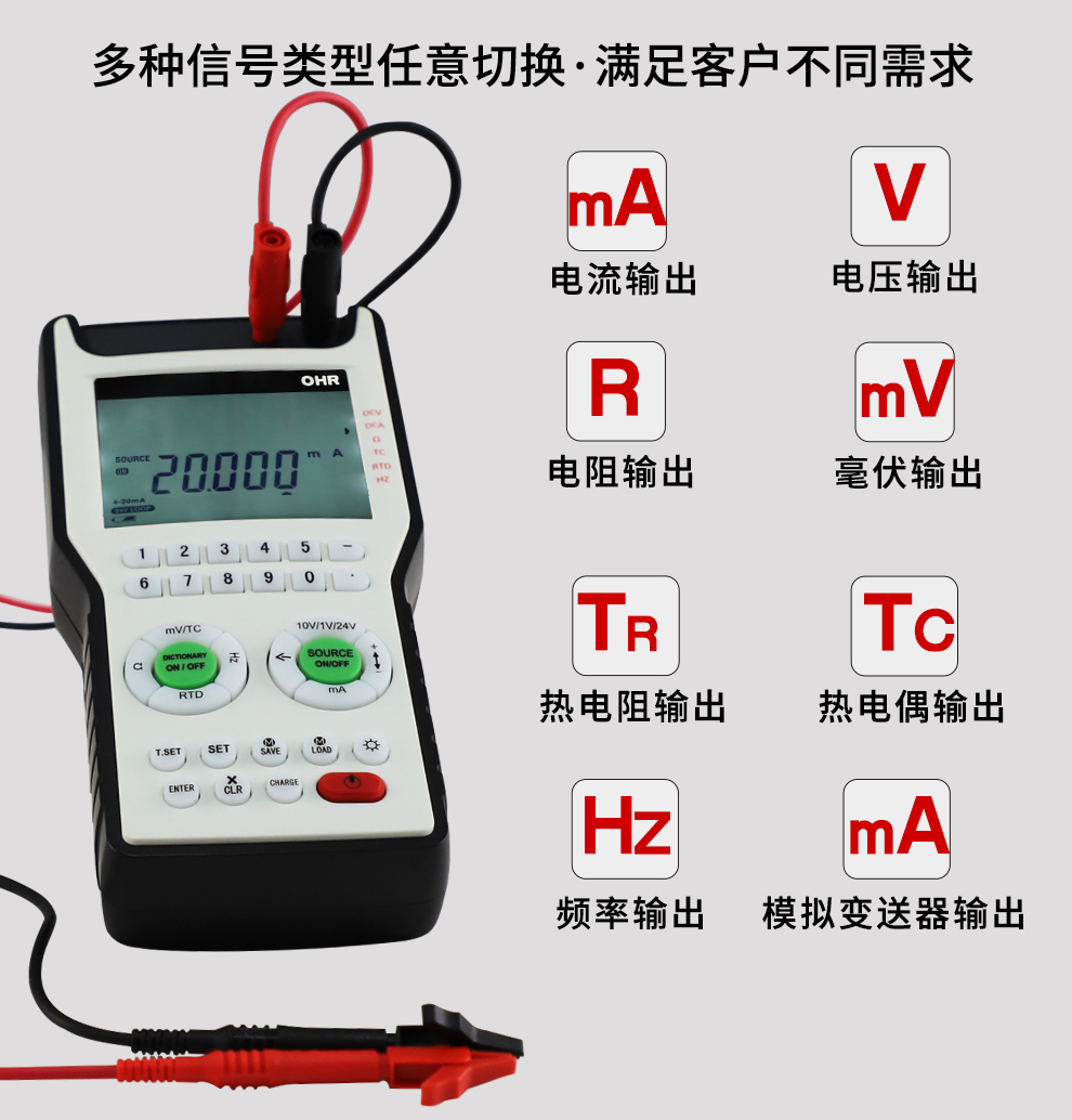 OHR-B00信號發(fā)生器是一種多功能、高精度的便攜式信號源,可用于輸出各種規(guī)格的工業(yè)信號,支持電流、電壓、電阻、頻率、熱電偶、熱電阻等多種信號輸出類型,最高精度可達0.01%F.S,是工業(yè)現(xiàn)場、實驗室以及各類儀表制造商必備的計量測試工具。