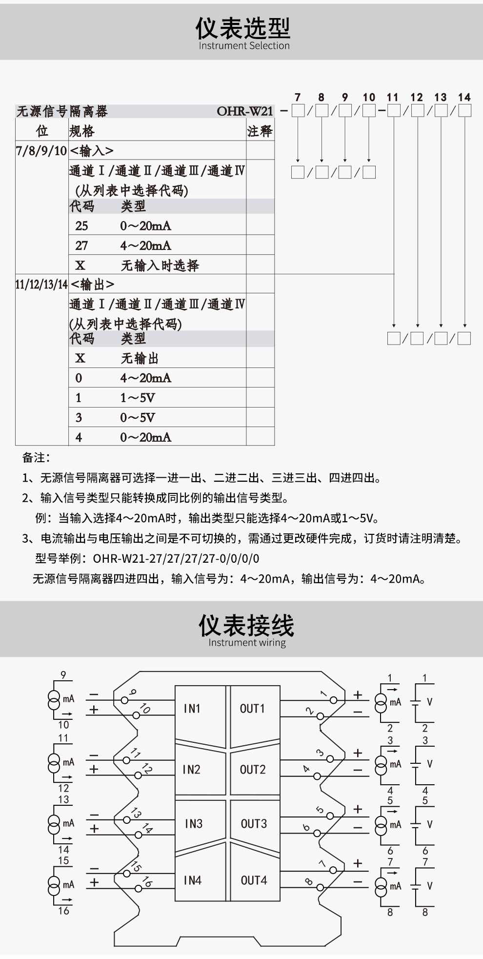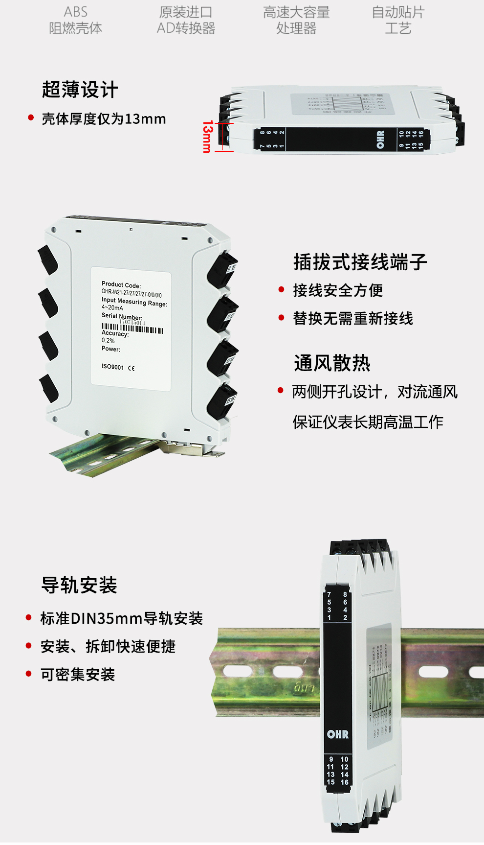OHR-W21系列無源信號隔離器無需外供電源,由輸入回路供電,實現信號隔離。可以與各種工業(yè)傳感器、現場儀表配合,取回參數信號,隔離變送傳輸,滿足用戶本地監(jiān)視遠程數據的需求。本產品品種分為一進一出、兩進兩出、三進三出、四進四出,且輸入、輸出磁隔離。