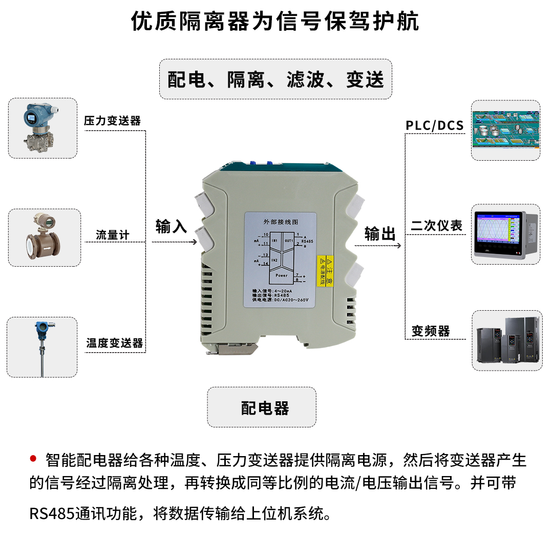 NHR-X33系列導軌式智能配電器給二、三線制變送器提供隔離的電源電壓,將變送器產生的直流電壓電流信號,經本隔離器轉換成所需的輸出信號至控制系統(tǒng)。寬電源設計:20-260V交直流供電。配置高清顯示單元,通過輕觸按鍵設置每個通道的參數及每個通道之間的切換。