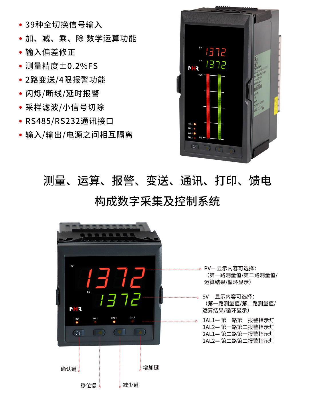NHR-5200系列雙回路數(shù)字顯示控制儀針對現(xiàn)場溫度、壓力、液位、速度等各種信號進行采集、顯示、控制、遠傳、通訊、打印等處理,構(gòu)成數(shù)字采集系統(tǒng)及控制系統(tǒng),廣泛運用于電力、石化、冶金、輕工、制藥、航空等諸多領(lǐng)域。